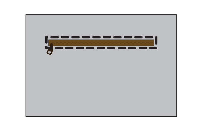 Match the right side of the zipper with the wrong side of the fabric. Pin in place and stitch in a rectangular shape on the right side of the fabric.